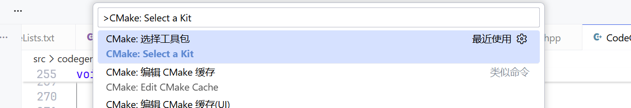 首先 Ctrl + Shift + P 调出命令窗口,输入 Cmake: Select a Kit 选择工具包