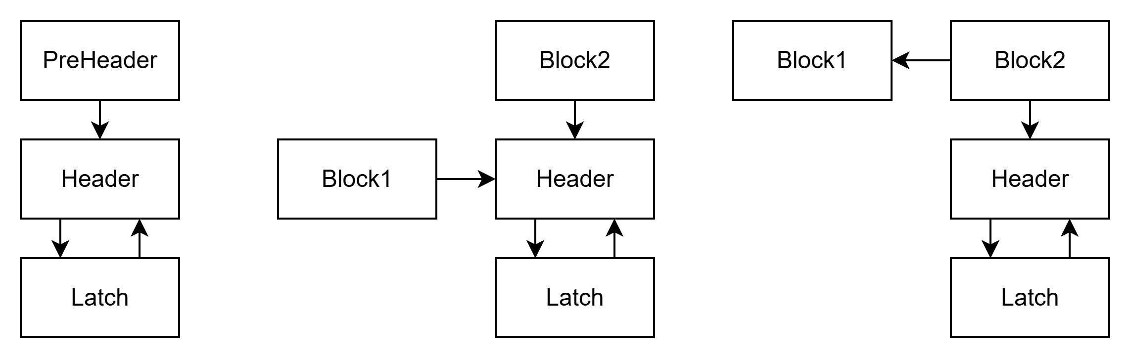如果已经像左图一样存在这样的基本块,就可以直接拿它作为 PreHeader,如果不存在,就需要在 Header 前面创建一个 PreHeader 块,并且将 Header 原来前驱的跳转都指向 PreHeader。
