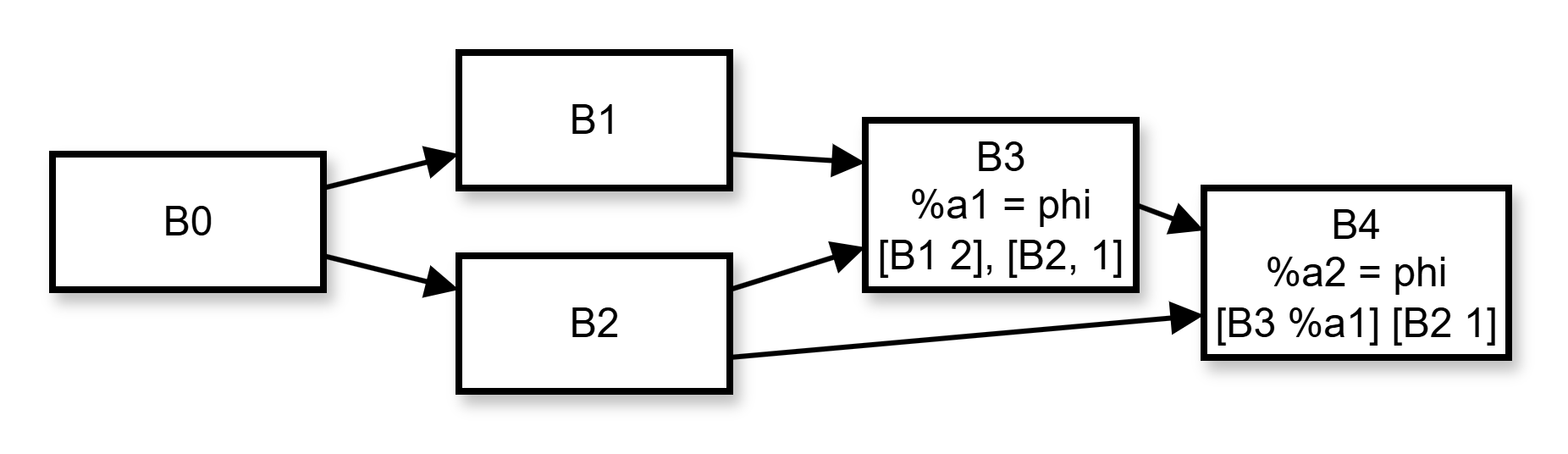 不过我们可以在 B3 中插入 %a1 = phi [B1 1], [B2 2],这样就能把 %b 替换为 %a1 了,对于 B4 同理。