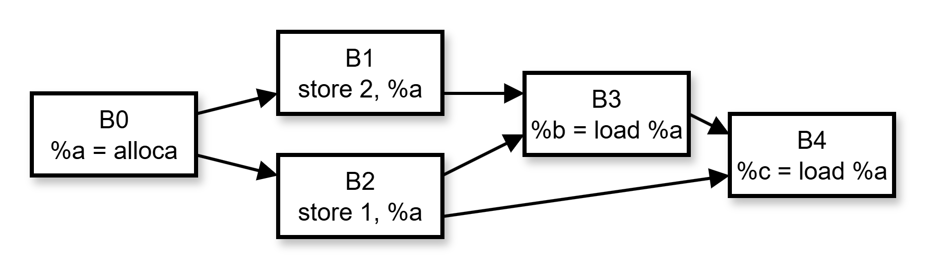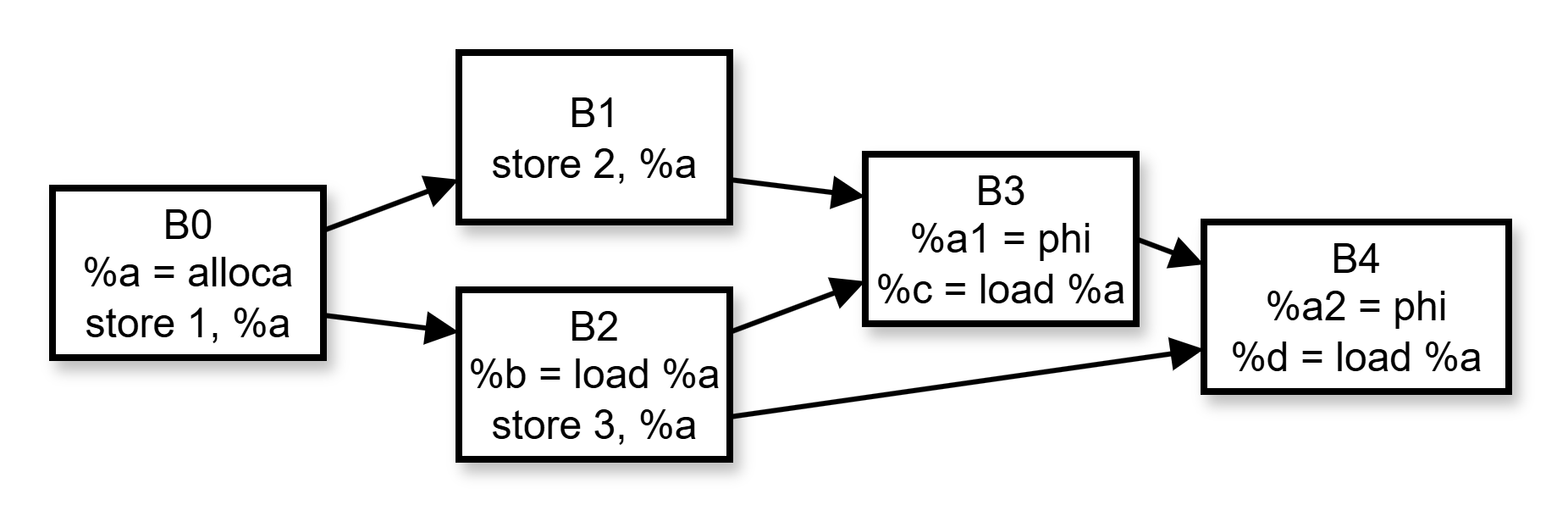为了描述方便,下面假设所有 alloca 都分配非数组,并且所有 load 和 store 都存取这些 alloca 变量,这样 Mem2Reg 会将它们全部消去。我们称这些 alloca 变量为临时变量。