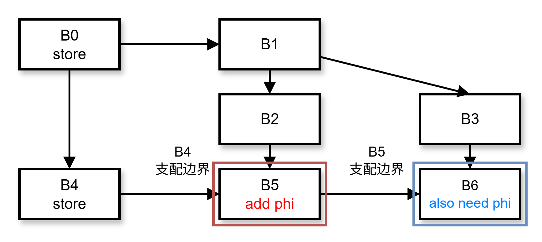 这样我们得到,我们需要在所有 store 指令所在基本块所在的支配边界上插入 phi。这样尚且还不能满足需求,我们插入的 phi 在其基本块的支配边界又会遇到上面一样的问题,所以需要再次在支配边界插入 phi,例如下图: