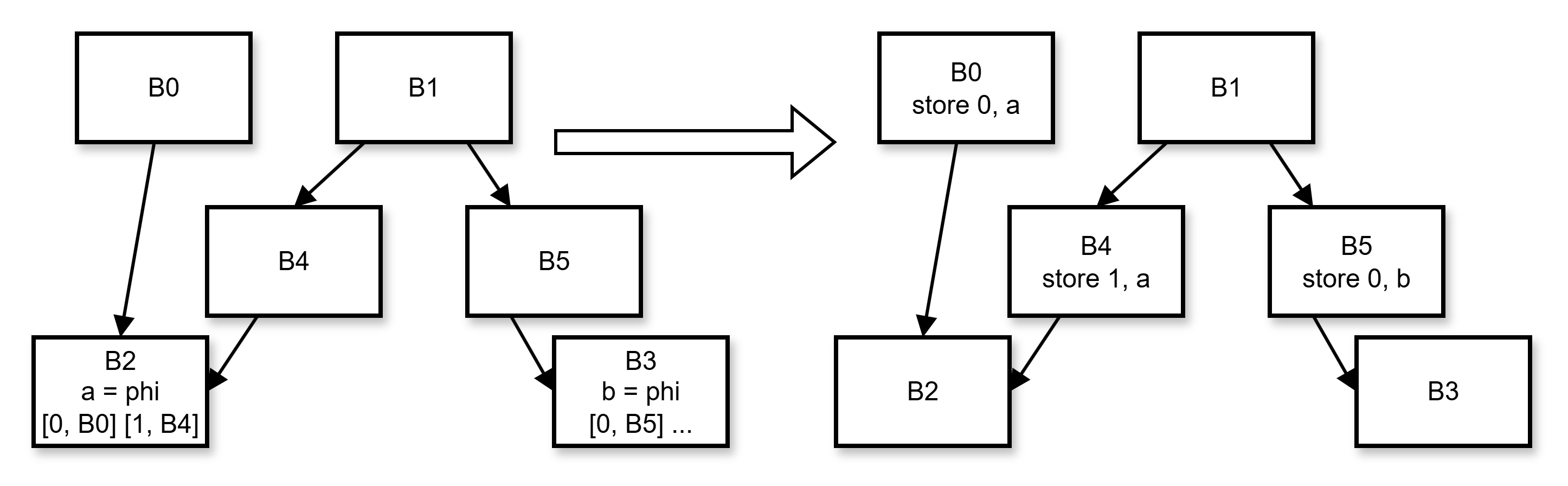 现在我们得到 %op1 = 0, %op2 = 1,它们替换 %op1 和 %op2,就得到了消除了所有 load 和 store 的代码(原来的 %op1 = load 在全部替换完之后删掉)。我们把这个替换的过程叫做 rename。