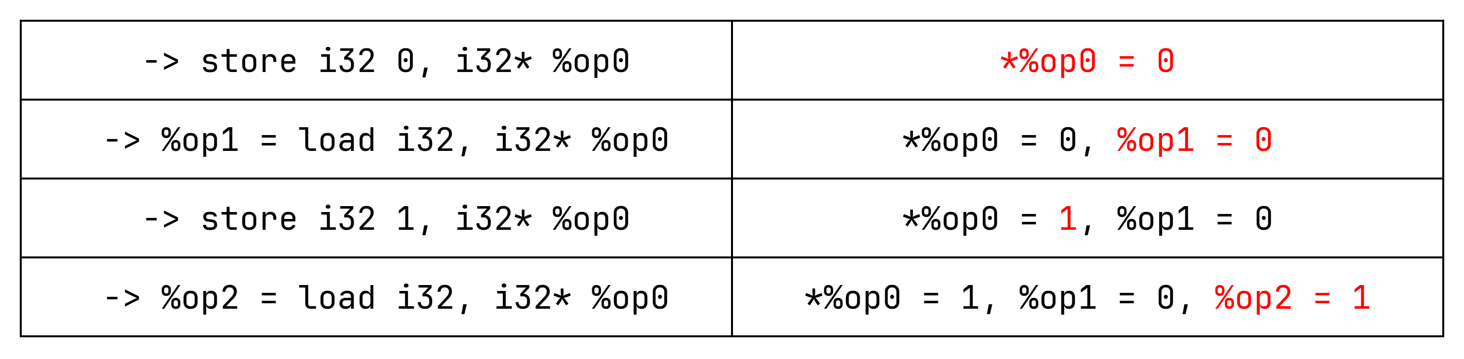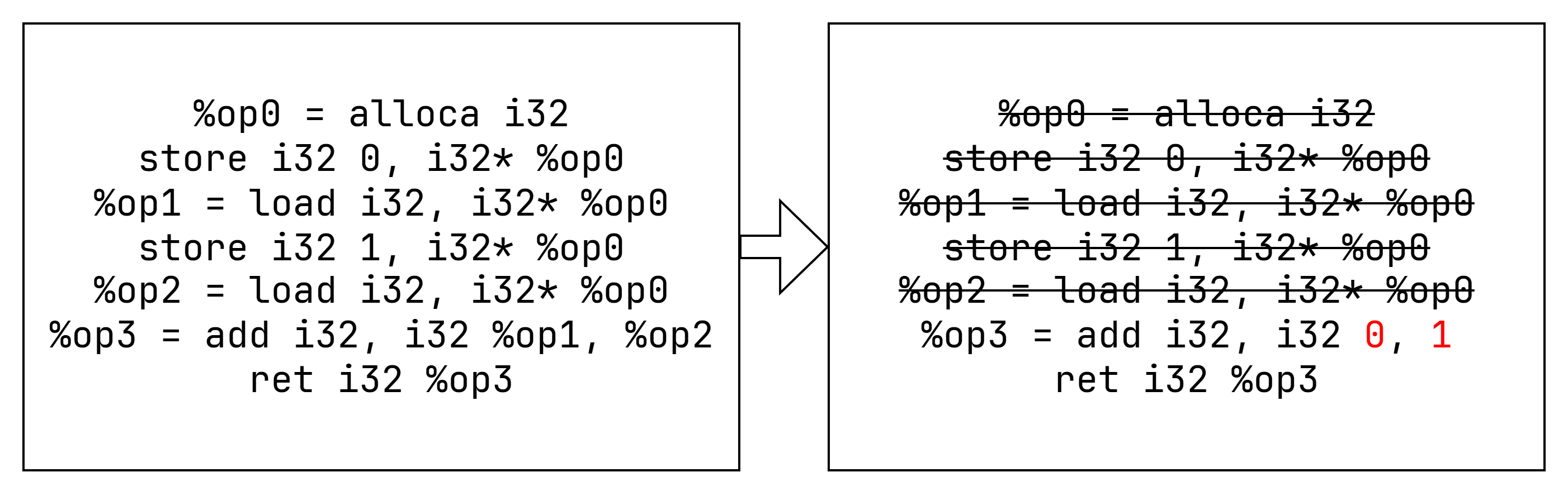 可以将 %op0 消去,这是因为当执行 %op1 = load i32, i32* %op0 时,我们知道在 %op0 中存储的 0,所以可以直接拿 0 替换 %op1,同理可以拿 1 替换 %op2。