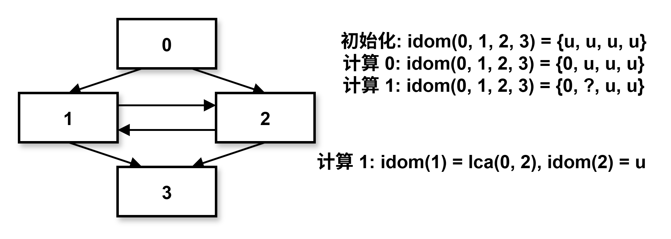 在这个算法的实现中,每次迭代,将节点的直接支配节点设置为 idom 非空的前驱的公共祖先。非空 主要是为了解决以下情况: