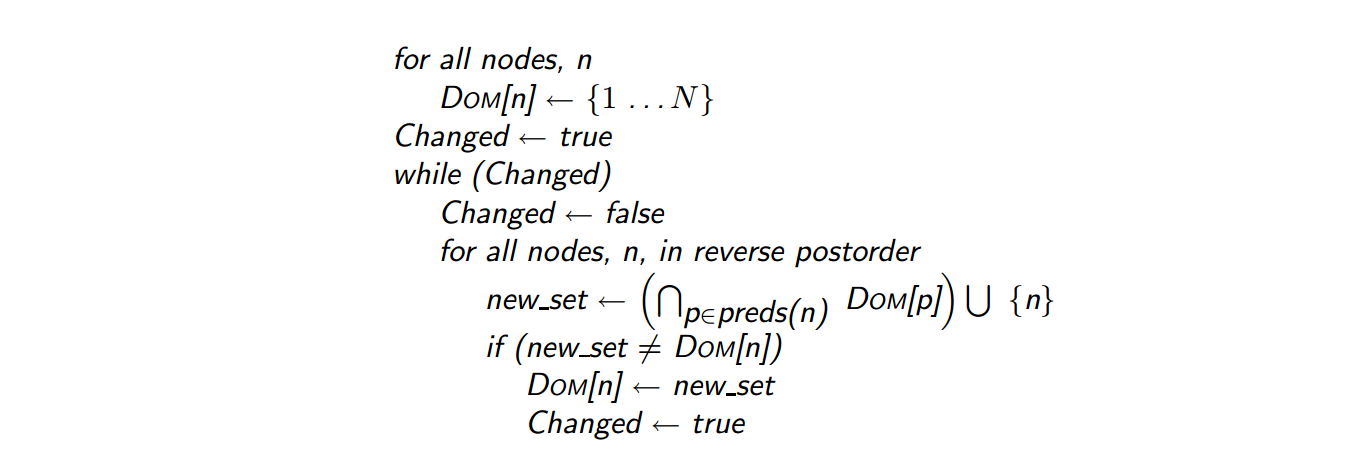 可以通过数据流迭代来求解。迭代开始, 所有节点的支配节点集合都被设置为全集,迭代按照逆后序进行以获得最大效率。