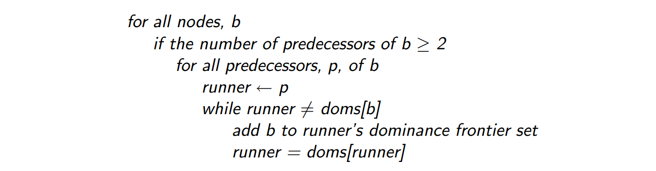 直观上来说, \(A\) 的支配边界就是它刚好支配不到的节点。即不被 \(A\) 支配, 但有 \(A\) 所支配节点作为前驱的节点集(并不需要所有前驱都被 \(A\) 支配)。